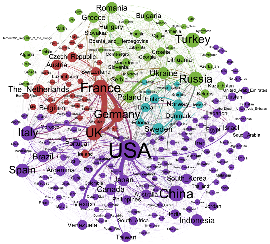 - Green: Eastern Europe and the Balkan countries (strong links among Turkey, Russia and Poland)