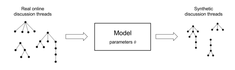 Modeling approach considered in the review: the model (box in the middle) represents a mechanism or procedure that describes how discussion threads are formed. It is usually governed by a set of parameters θ which are typically learned from real data composed of real discussion threads. This learning step involves some type of optimization. For given parameters θ, the model can be used to generate synthetic threads that reproduce the properties of the real discussion threads